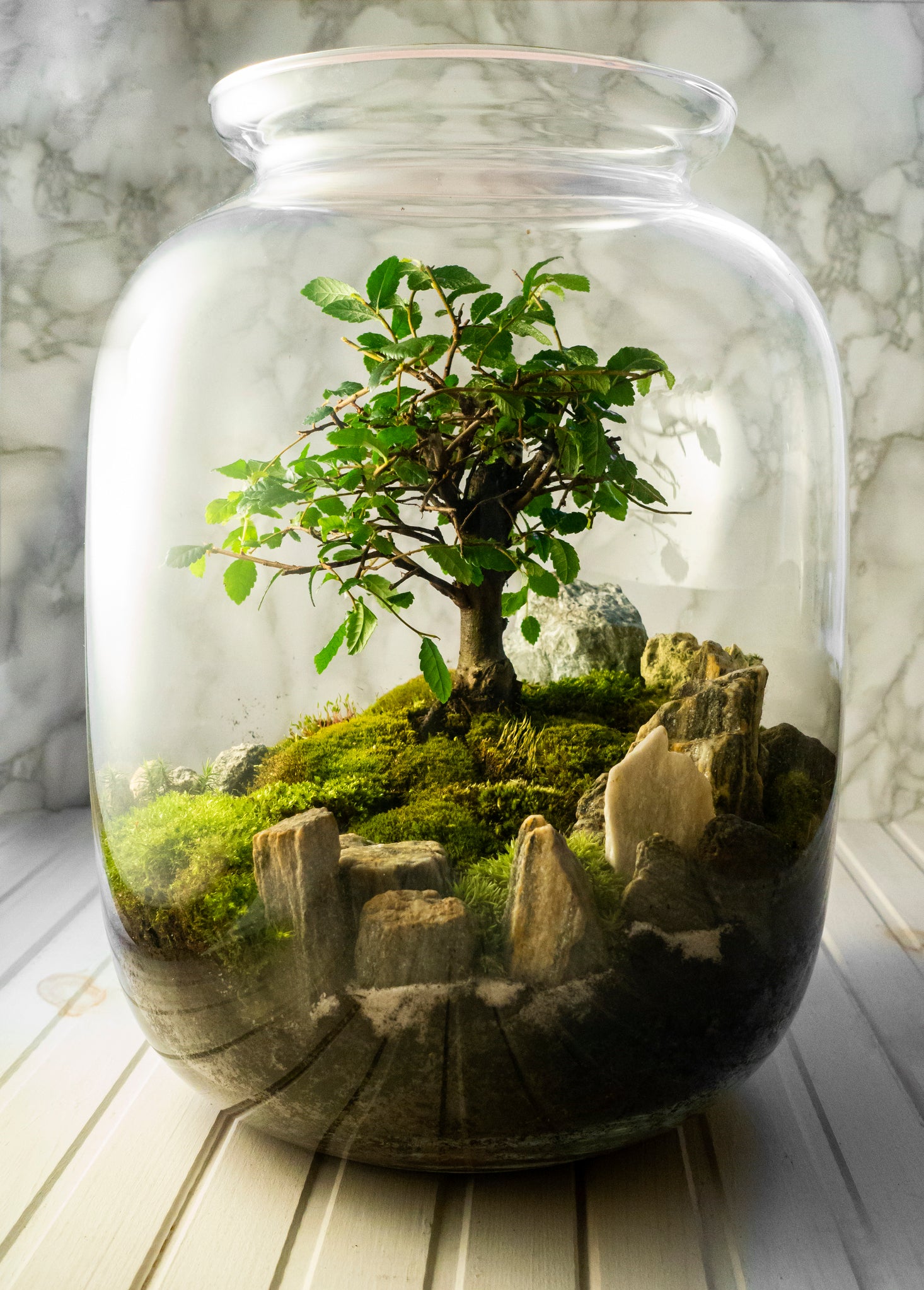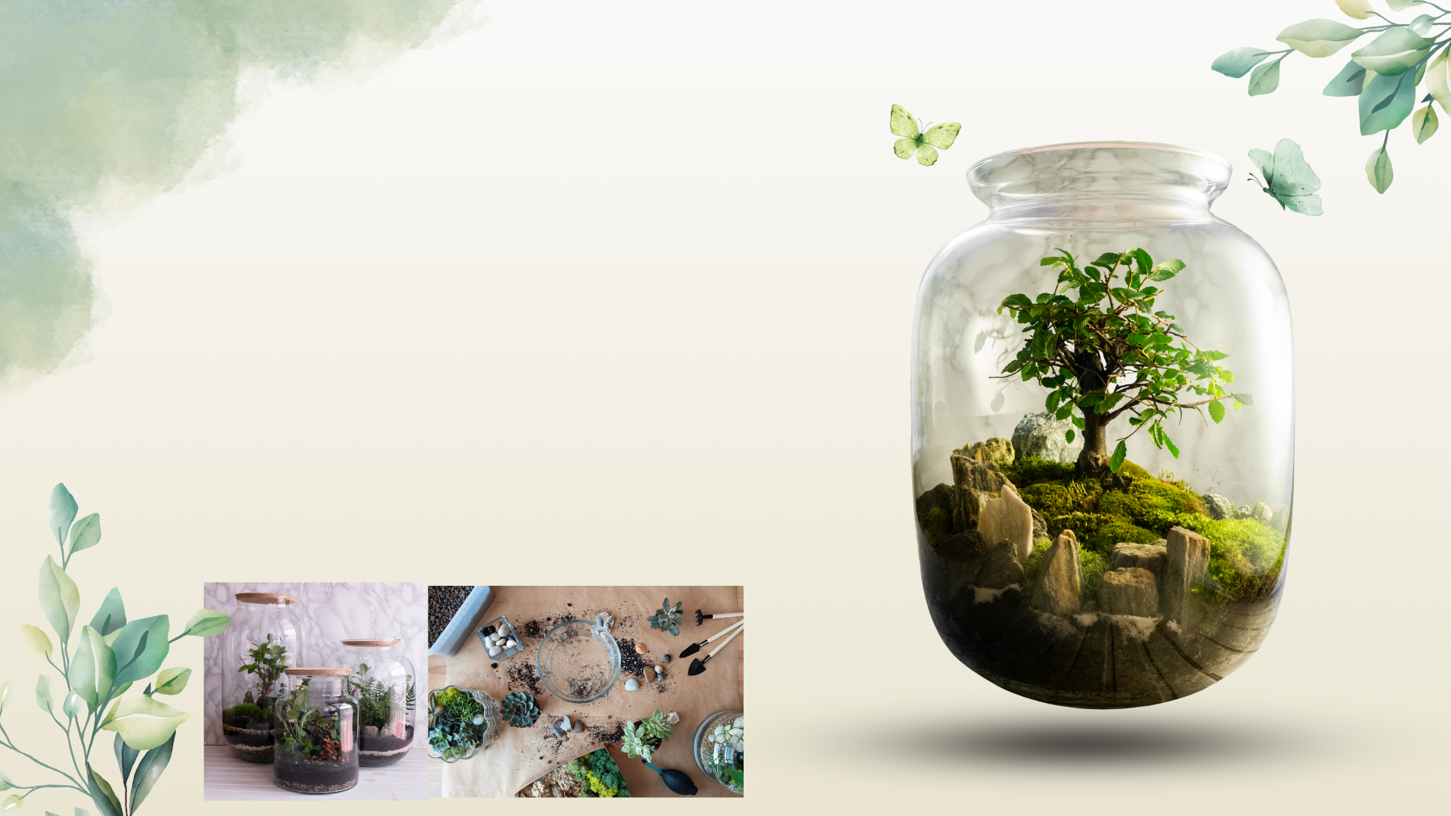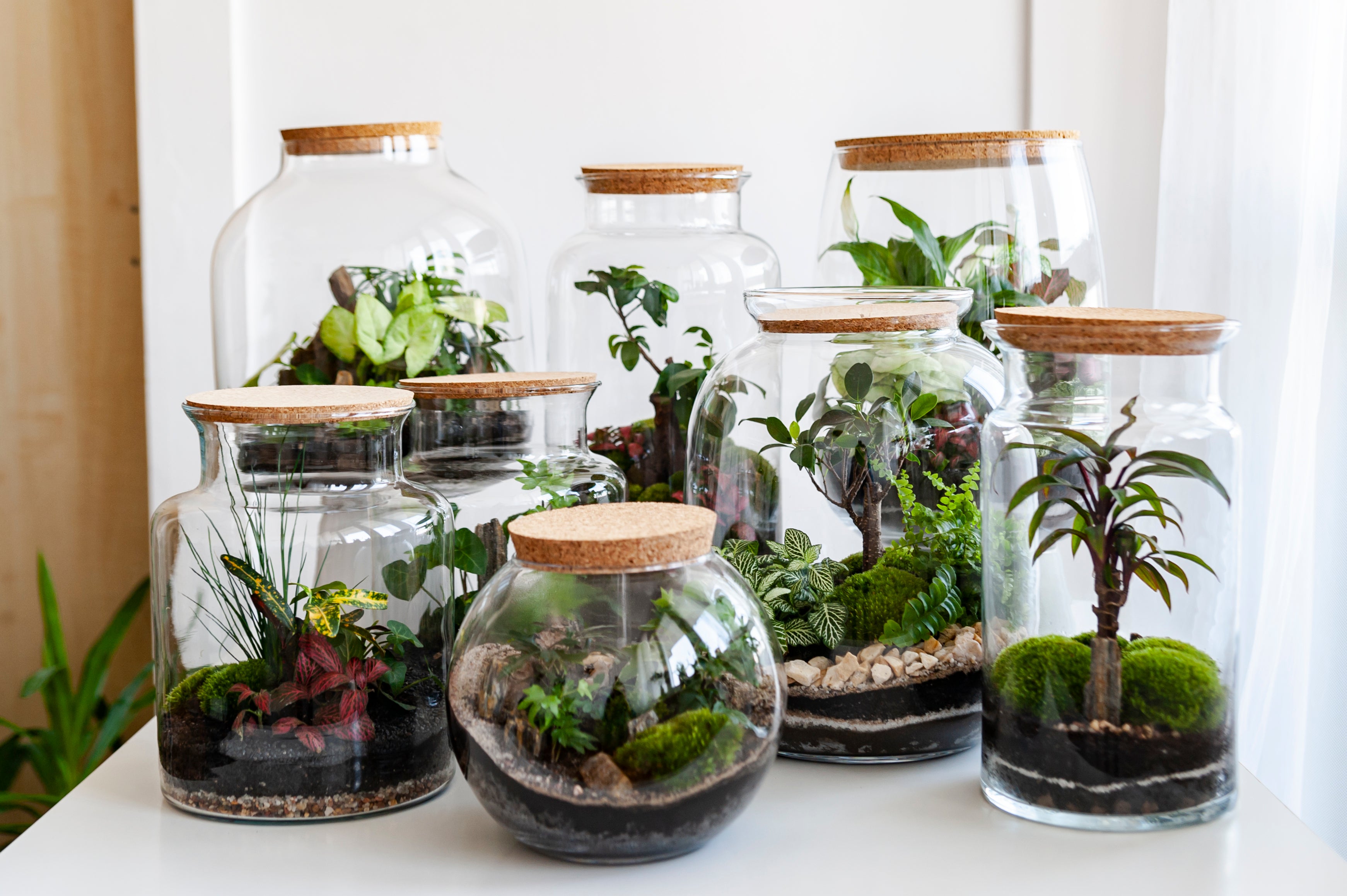 • Closed terrariums: Ideal for ferns, moss, and tropical plants (humid environment). Wire or Cork jars work very well.