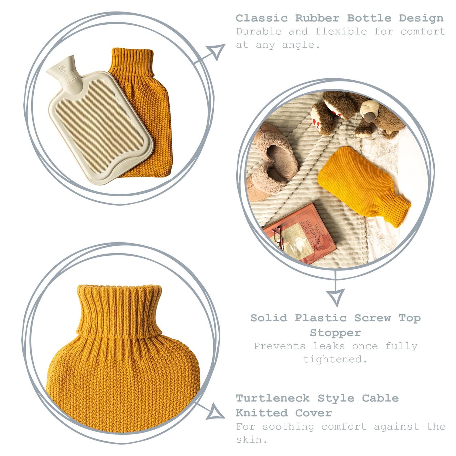 Classically designed from durable rubber, this bottle offers perfect, swift salvation from any winter chills, as well as helping to alleviate aches, pains and cramps in times of need. A cute turtleneck-style mustard cable knitted cover sits comfortably against the skin, while filling is made easy thanks to the leakproof solid plastic screw top stopper in the spout.