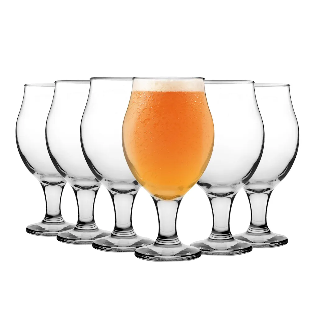 Designed to trap and maintain the foam head, the tulip glass helps enhance the flavor and aromatics of hoppy and malty brews. Much like the goblets and snifters, these types of beer glasses have a small stem and footer with a unique, tulip-like bowl on top.